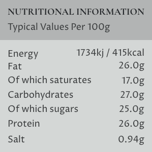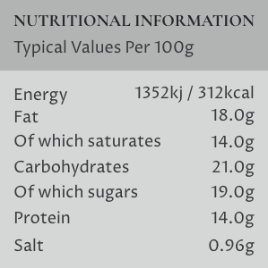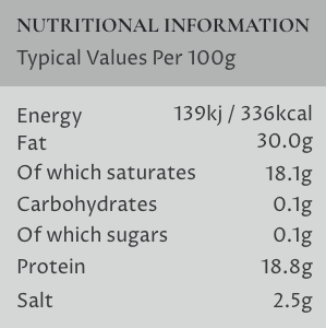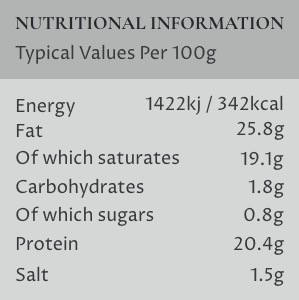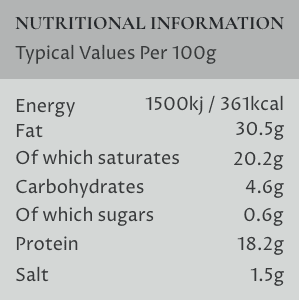 Ingredients: Pasteurised Cows MILK, Salt, Vegetarian Rennet, Penicillium Roqueforti, Dairy Cultures (Allergens in BOLD).