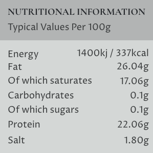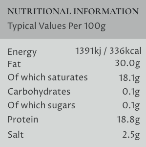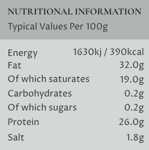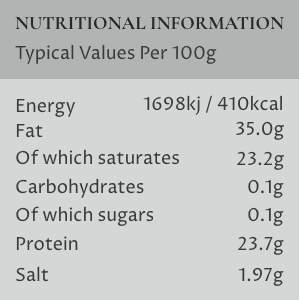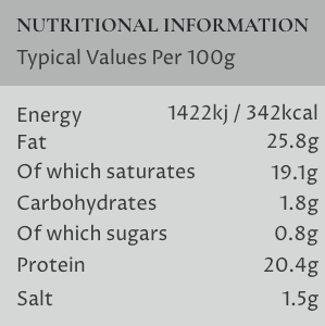 Ingredients: Pasteurised Cows MILK, Salt, Vegetarian Rennet, Penicillium Roqueforti, Dairy Cultures (Allergens in BOLD).