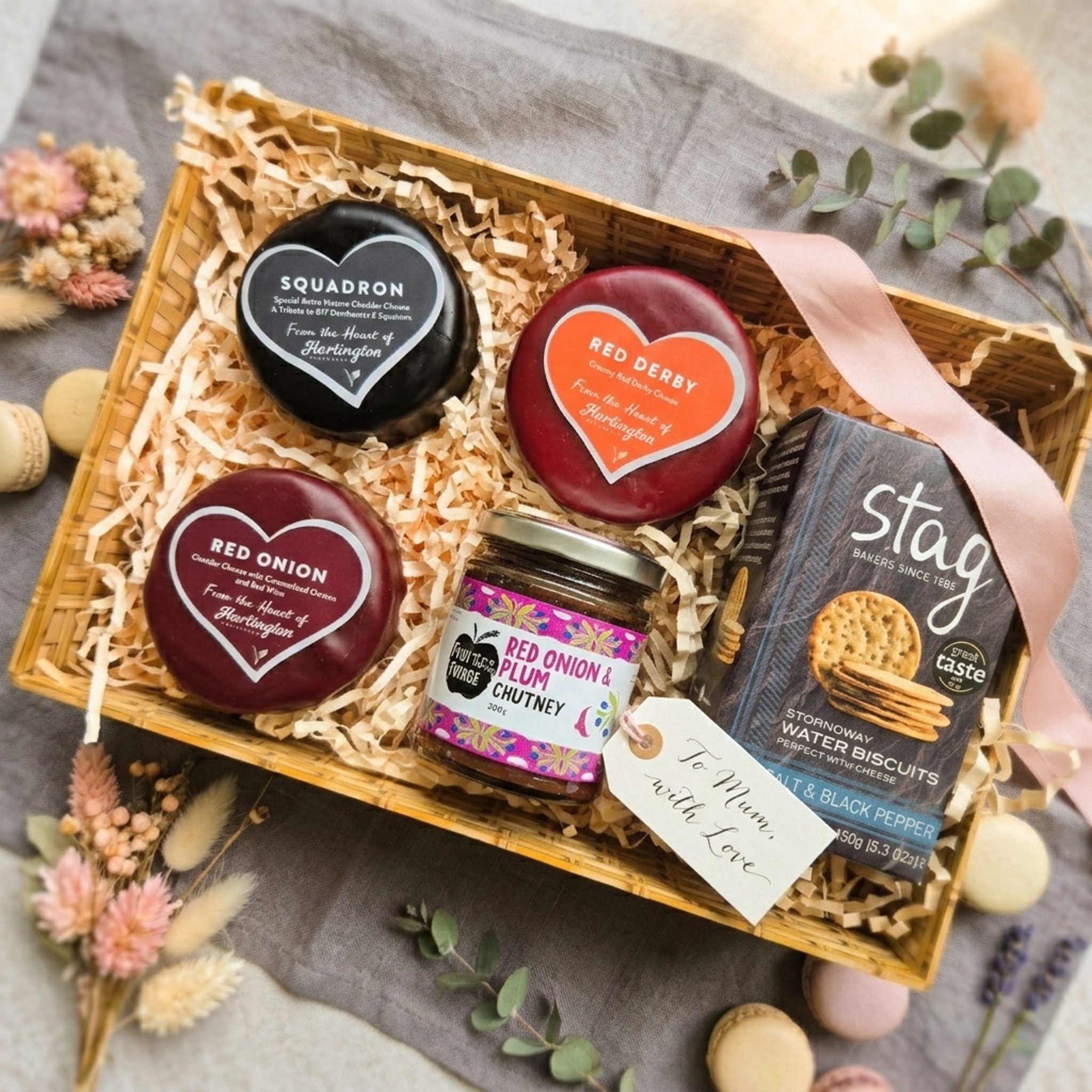A generous and beautifully presented selection designed to create a memorable Mother’s Day cheeseboard. This indulgent hamper includes four of our 180g waxed truckles, artisan crackers, and a carefully chosen chutney — bringing together a balanced mix of mellow, savoury, and gently spiced flavours.